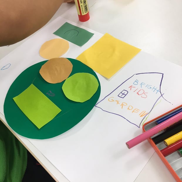 この日は、circle 丸 square 正方形 triangle三角形 rectangle 長方形 など、様々な形を使いながら、一人一人がそれぞれの好きな世界を表現してくれました。