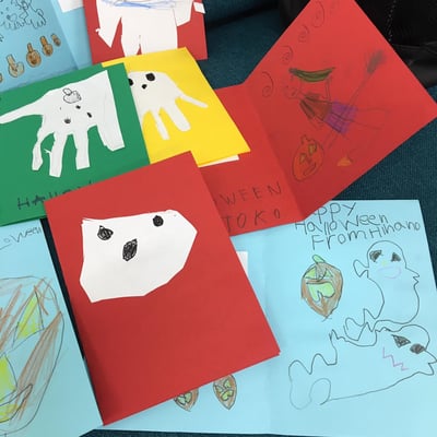 手形で作ったお化け、中にはイベント予定とメッセージ、自分でデザインしたアートも。