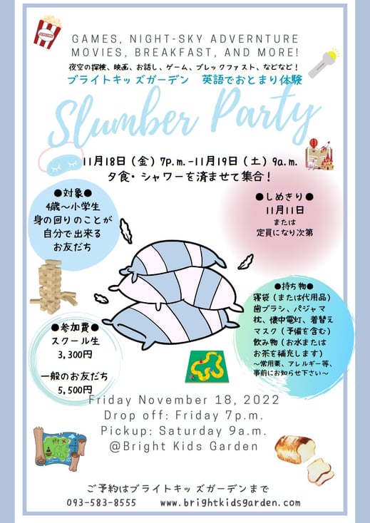 2022/10/15 Slumber Party 英語でお泊り 英語絵本の時間、映画の時間、 夜空の探検も。 英語でお泊り会を開催します。 いつもはおうちで日本語で過ごすことが 多いかもしれない時間帯を スクールで英語でも楽しみましょう。 Slumber Party 詳細 tagPlaceholderカテゴリ: 2022年10月