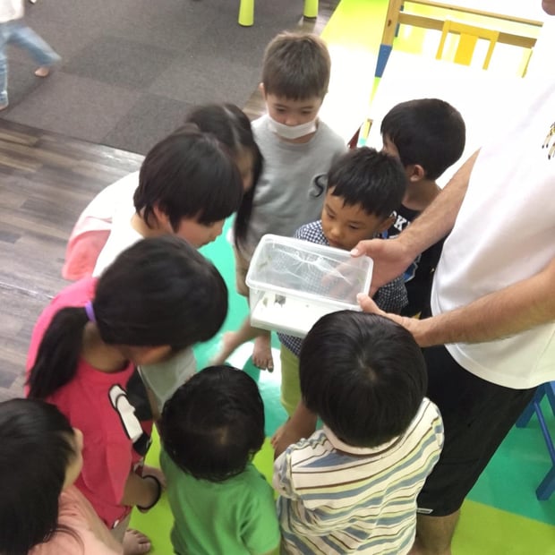 お友達がアオムシさんをスクールに連れてきてくれました。 毎年お庭に集まるという、蝶の赤ちゃんたち。 今年もそのうち2匹をお持ち下さり、みんなで成長を見守ることが出来ます。