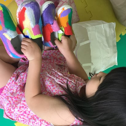 今日の Show and Tell では、Mちゃんが代表でした。 たのしい3Dパズルと、自分でペイントをしたシューズを持って来てくれました。