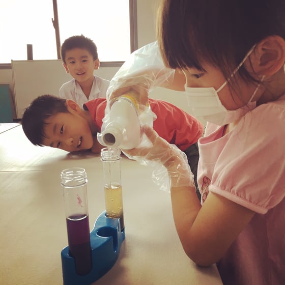 小学生対象の英語学童保育アフタースクールのお友達。 この日は、化学の実験で、液体の成分を学びました。