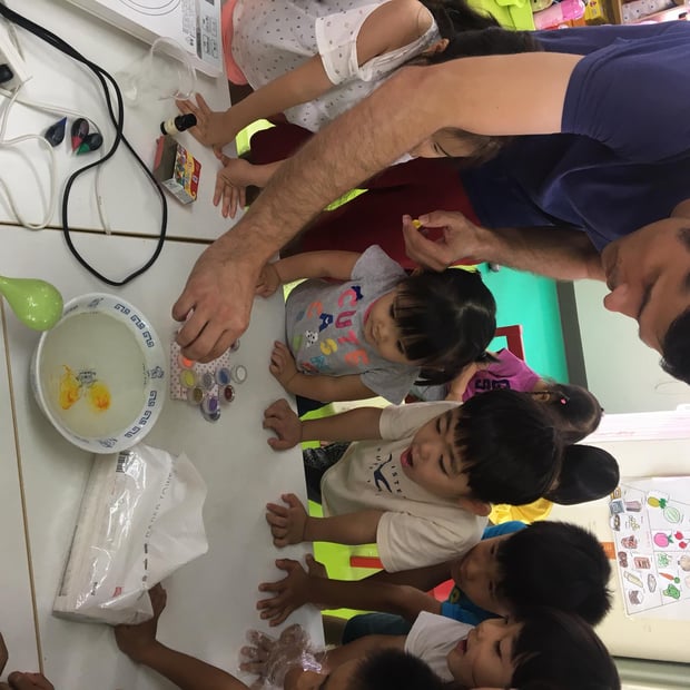 英語でアートクラスの特別夏クラスがスタートしました。 初日も色々な材料を使って、子ども達とMs. Mayが伸び伸びと作品を仕上げました。