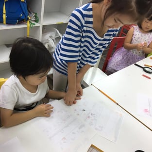 毎週、本当にたくさんの体験を通してアート作品を作り出す子ども達。 この日は、にじみ絵と、プチプチの梱包材やスポイトなど、様々な身の周りのものを使って昆虫や生き物を描きました。