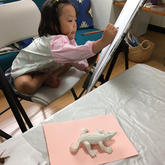 真剣な眼差しでイーゼルに向かって写生に取り組む子ども達。 この日は、目の前に置かれた、本物のセミやハチなどの昆虫、恐竜や爬虫類などのミニチュアをじっくり観察していました。