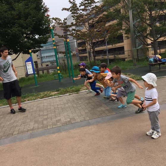 徒歩圏内に自然や広々とした公園に恵まれているスクール周辺。 お天気に恵まれた日は出来るだけ外遊びを楽しみます。 この日の運動量も相当なもの!水筒の飲み物がなくなるお友達が続出しました。