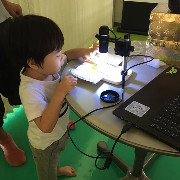 顕微鏡の世界を堪能しながら、身の周りのものを探究中の子ども達です。 この日は何を見たか、上の記録(Kくんの Daily Journal より)からご覧いただけるでしょうか。