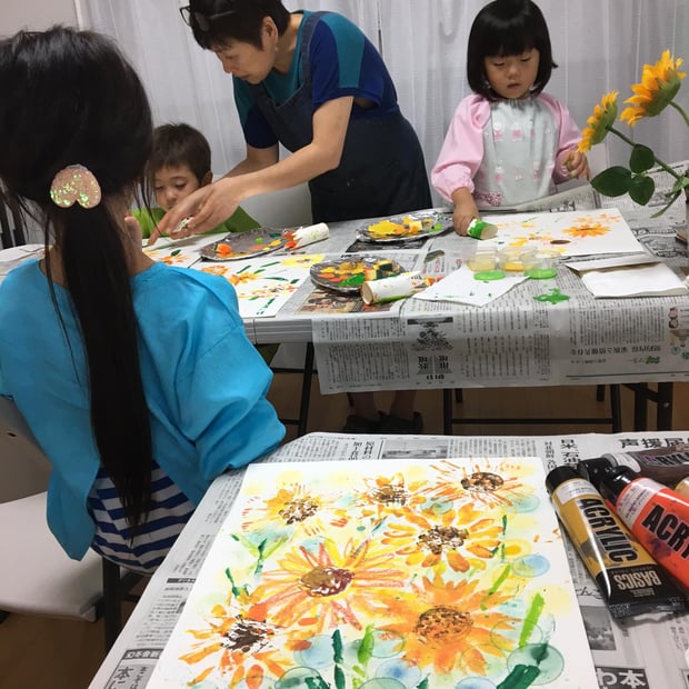 ヴァン・ゴッホの名作ヒマワリに、色々な画材・画法を使って子ども達がチャレンジ! Ms. Mayの英語でアートクラスでは、この日も子ども達の感性が光っていました。