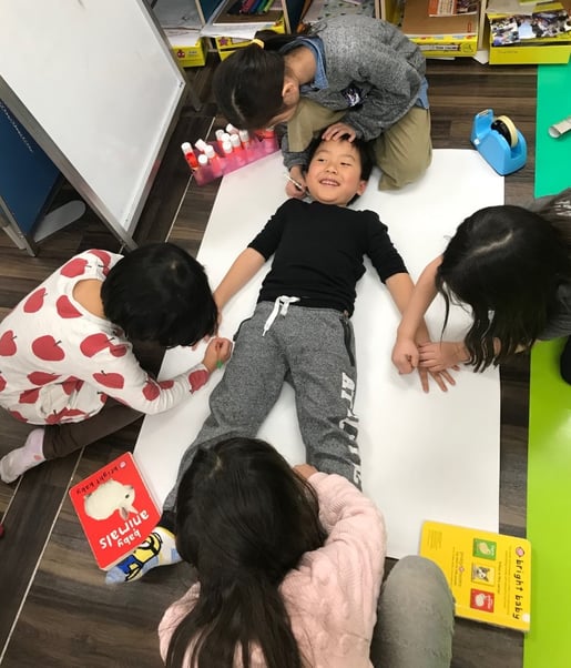 お友達の体のラインをなぞって、等身大の人体を描くスクール生です。 その中にひとつひとつの臓器を加え、それぞれの果たす役割を学びました。