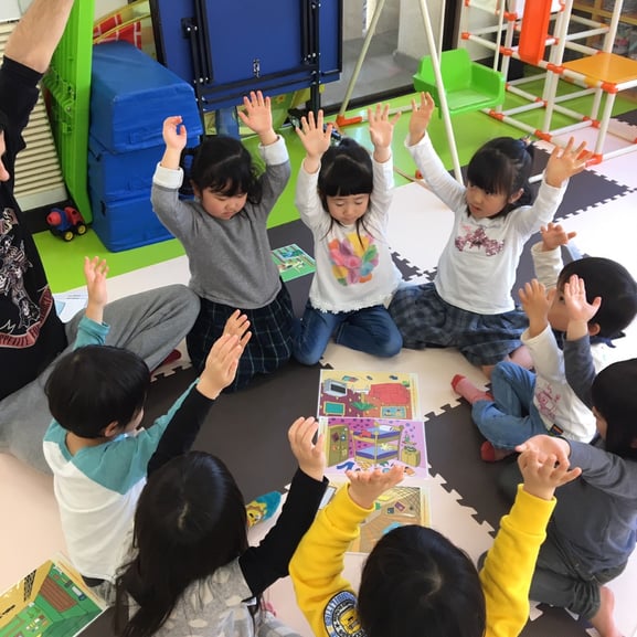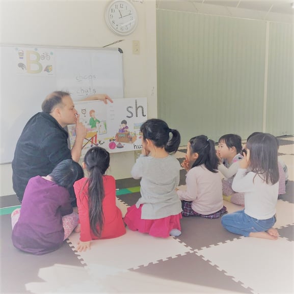 先生が子ども達に「シー静かに」と注意をしているところ・・・ではありません。 アクションやお話を通して、子ども達が、shの綴りと音を学んでいるところです。 絵本のお話の中では、赤ちゃんが寝ている横で、 お母さんが遊んでいるお兄ちゃんに "sh・・・・・"と言っています。