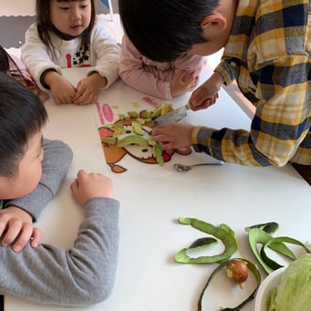 Botany 植物学をテーマに、スプリングスクールを満喫中のおともだち。 この日は、野菜たっぷりのサラダづくりを楽しみました。