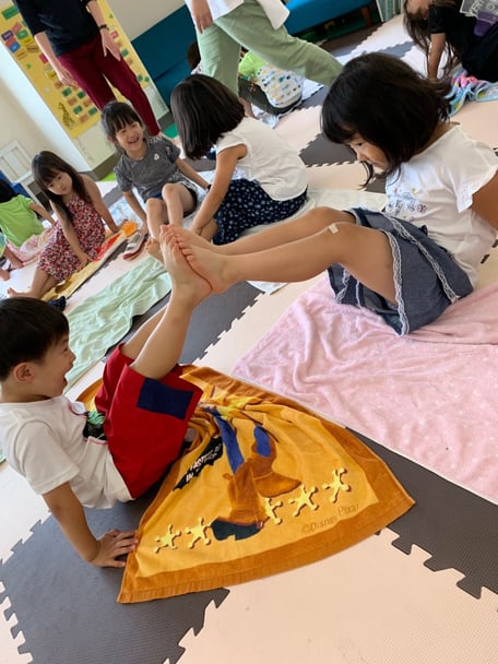 一人ずつ、呼吸を整えたり、ポーズをしたりするヨガもひとつ、 パートナーと一緒に行うヨガは、子ども達にとっても異なる楽しさがあるようです。