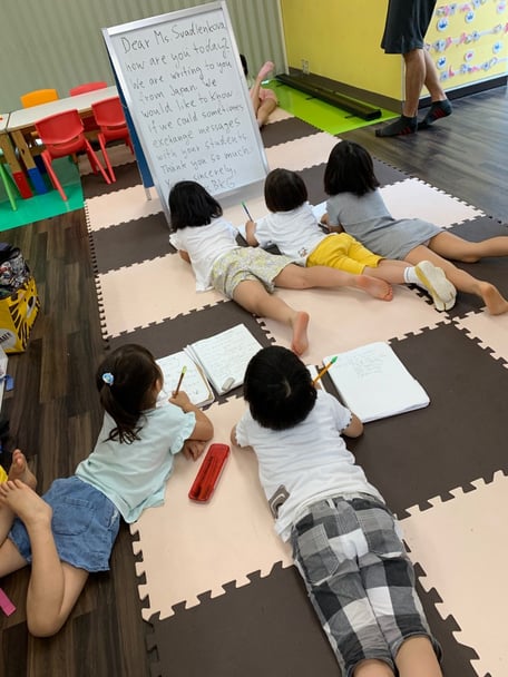 リラックスした姿勢で何やらノートにまとめているスクール生達。 大きなお友達のグループでは、 今月、電話やE-mail など、コミュニケーションの方法について学びました。