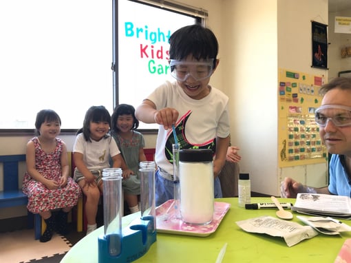 化学反応の実験に夢中なスクール生。 先週に続き、この日は「キャベツの粉」や小麦粉も使っての火山噴火のような実験です。