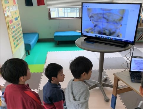 顕微鏡を通して、スクリーンにダイナミックに映し出されたのは、 あおむしさんの抜け殻(頭の部分)。 さなぎになる前に脱皮したものです。