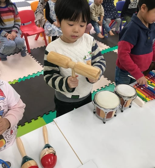 学年末の発表会に向けて、ゆっくり準備を始めています。 今年度、演奏部門で使用する予定の楽器を みんなで手に触れて身近に感じてもらいました。